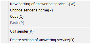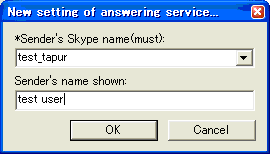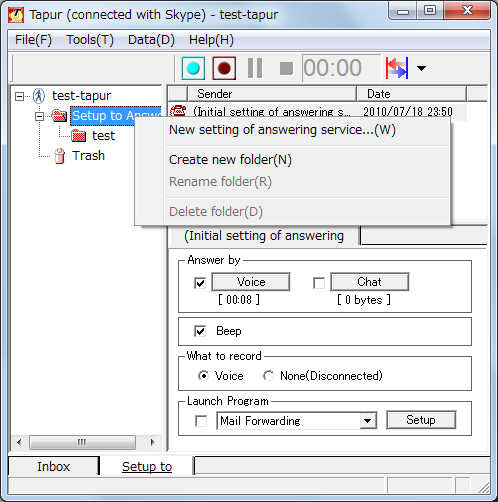 You can change the display for [Inbox] and [Setup to Answer] by selecting a tab of the lower left. Tapur offers [Initial setting of answering service], but you can set your own answering message according to senders. Right-click [Setup to Answer] and [New setting of answering service].   In [New setting of answering service], after you input sender's Skype id, new "setup to answer" is created. New "setup to answer" has same setting as [Initial setting of answering service]. You can customize it. [Setting of answering message] You can input messages for an answering machine function. Choose "Voice", "Chat", and input a wave file, a chat message. You can choose duplicate answers". *"Video" and "Image" message functions are finished because of limitation of Skype API.