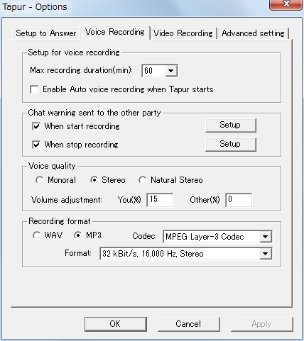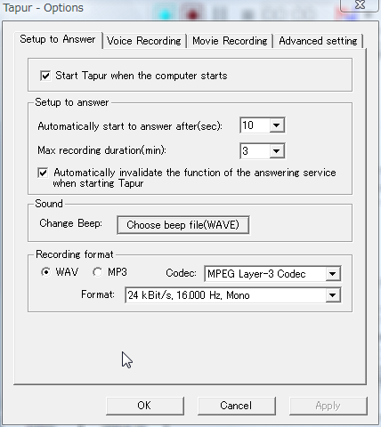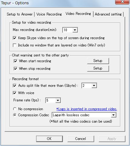 [Setup to Answer]-[Setup to Answer] Setup for answering machine function.This setting is common with all answering machine function. +"Max recording duration" is applied in the case of a voice recording at the time of answering machine. +When you want to invalidate answer machine at the time of start of Tapur, check "Automatically invalidate the function of the answering service when starting Tapur". [Setup to Answer]-[Sound] You can change Beep sound (WAV file). This setting is common with all answering machine function. [Setup to Answer]-[Recording format] Setup for the recording format of the audio file. If you want to output the mp3 format, WindowsMediaPlayer10 more is required. And if you use the LAME MP3, you can download the installler from [Help] - [Lame MP3 ACM codec].  [Voice Recording]-[Setup for voice recording] +"Max recording duration" is applied in the case of a voice recording on line. This is not for answering machine function. +When you want to invalidate auto recording at the time of start of Tapur, check Enable Auto voice recording when Tapur starts". [Voice Recording]-[Chat warning sent to the other party] Tapur display a warning message to caller at the time of start time and the end of recording. Messages are reset to system default by clicking "Reset" button. [Voice Recording]-[Voice quality] +You can choose sound quality from "Monoral", "Stereo", "Natural stereo". At the time of answering machine recorded voice is always monoral. "Stereo" recording completely divides a sound of yourself and caller on a truck of right and left. When you wants to edit recorded file later, you had better to use this option. "Natural stereo" recording creates natural sound than "stereo" recording, but is not suitable to edit recorded file. +"Volume adjustment" change the volume level of recorded file. You had better to use this function when the volume level of your voice doesn't match with the other voice. The volume of speakers doesn't chenge when recording. [Voice Recording]-[Recording format] see [Setup to Answer]-[Recording format].  [Video Recording]-[Setup for video recording] +"Max recording duration" is applied in the case of a video recording on line. +The video recording is realized by capturing screen of Windows. Therefore the state will be just recorded when the other application shut out the screen of Skype.Tapur locks the screen of Skype automatically on the front to avoid this while you record movie. You can cancel this lock by "Keep Skype video on the top of screen during recording" check. +"Include no window that are layered on video" : record skype video only without "Keep Skype video on the top of screen during recording" check. This function is effective for windows 7 only. [Video Recording]-[Chat warning sent to the other party] Tapur display a warning message to caller at the time of start time and the end of recording. Messages are reset to system default by clicking "Reset" button. [Video Recording]-[Recording format] +"Auto split file that more than" : You can split huge recorded file automatically. +"With voice" : create a video file with voice. If not, video file without voice and audio file created. +You can choose compression format of recorded video file. If you want to edit recorded file, choose "non-compression". If you want to use compression codec, you had better to use Lagarith lossless codec or UT Video Codec installed by Tapur installer. Compression codec list depends on your PC environment (OS, installed application, etc...). You can't use all of codecs displayed on the list. Some formats is immpossible to use. *Recording with compression codec need license code. Without license code you can record video by compression codec with Tapur logo.