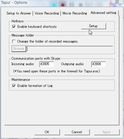 [Advanced setting]-[Message folder] Usually Tapur use C drive to store message files. But you can change the message folder when your C drive is less. [Advanced setting]-[Commucation ports with Skype] Tapur communicate with Skype by tcp ports when recording. You can change these ports here. If the firewall is enable on your OS, you need open these ports in the firewall for Tapur.exe. [Advanced setting]-[Maintenance] You can output log file or not. (look FAQ [Trouble Report ] .)