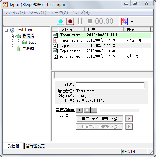 メッセージの再生や削除などの操作、フォルダの作成などを行います。 各メッセージには、『件名』を設定することができます。 メッセージを再生する場合、『受信箱』タブを表示し、メッセージを選択、『音声/動画:』操作ボタンを操作してください。  [メッセージアイコン] 各メッセージの先頭のアイコンで、メッセージの種別を区別できます。 留守番で録音したファイル:  通話中で録音したファイル: 通話中で録画したファイル:  アイコン左上の"I", "O"は受信通話、発信通話を表します。 アイコンのないメッセージは、留守番応答時に録音が行われなかった場合を表します。 [録音・録画ファイルのエクスポート] 録音・録画ファイルを取り出す場合は 『音声ファイル取り出し』、『録画ファイル取り出し』ボタンをそれぞれクリックしてください。 音声ファイルはwave, OggVorbis, mp3形式(※)でエクスポート可能です。  ※mp3形式のエクスポートには、WindowsMediaPlayer10以上が必要です。 [外部アプリケーションによる再生] 音声ファイル、 ビデオファイルはそれぞれWAV / MP3、AVI形式で管理されています。以下のボタンをクリックすると、OS上でそれぞれのデータ形式の規定のアプリケーション として設定された外部アプリケーションで再生が行われます。(WindowsMediaPlayer、RealPlayer、QuickTimeなど)