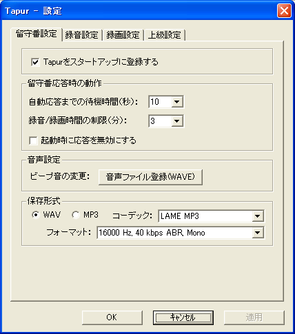 Tapur の各種オプション設定を行います。 『ファイル(F)』を選択し、『設定(S)』をクリックしてください。  『留守番設定』- 『Tapurをスタートアップに登録』 PC起動時にTapurを起動するか指定します。 『留守番設定』-『留守番応答時の動作』 ◎ 留守番応答時の『自動応答までの待機時間(秒)』、『録音時間の制限(分)』を規定の時間範囲内で自由に設定することが出来ます。 ◎ PCの起動時に自動応答を無効にしたい場合は、『起動時に応答を無効にする』をチェックして下さい。 『留守番設定』- 『音声設定』 『音声ファイル登録(WAVE)』ボタンをクリックすることによって、ビープ音の変更を行うことができます。ビープ音の変更は全ての応答設定に反映されます。
