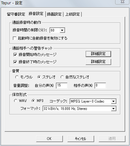 『留守番設定』- 『保存形式』 録音ファイルの形式を指定します。 mp3形式に出力する場合、WindowsMediaPlayer10以上が必要です。またLAME MP3を使用する場合、『ヘルプ』-『Lame MP3 ACM コーデック』からダウンロード/インストールしてください。  『録音設定』-『通話録音時の動作』 ◎ 通話録音時の『録音時間の制限(分)』を規定の範囲内(最大720分)で自由に設定することができます。留守番応答時の録音時間には影響しません。留守番応答時の録音時間を制限したい場合は、『留守番設定』タブの『録音時間の制限(分)』で設定できます。 ◎ PCの起動時に自動録音を有効にしたい場合は、『起動時に自動録音を有効にする』をチェックして下さい。 『録音設定』-『通話相手への警告チャット』 録音開始、終了時に通話相手に表示したいチャットメッセージを自由に設定することができます。『初期メッセージに戻す』ボタンをクリックすることによって、システムの初期メッセージにリセットされます。 『録音設定』- 『音質』 ◎ 通話録音時の音声を『モノラル』『ステレオ』『自然なステレオ』に指定することができます。留守番応答時の録音は常にモノラルです。 『ステレオ』録音は、通話中の自分と相手の音声を左右のトラックに完全に分離して記録します。録音したファイルを加工したい場合は、このステレオ録音をご使用ください。 『自然なステレオ』録音は、『ステレオ』録音より自然な録音を行いますが、録音ファイルの加工には向きません。 ◎ 『音量調整』は録音時の音量に対して一定の増減を行います。自分と通話相手の音量がアンバランスな場合に使用してください。録音時に聞こえる音量は変化しません。 『録音設定』- 『保存形式』 『留守番設定』- 『保存形式』を参照。