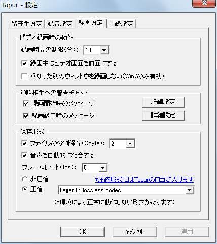 『録画設定』-『ビデオ録画時の動作』 ◎ 通話録画時の『録画時間の制限(分)』を規定の範囲内(最大360分)で自由に設定することができます。 ◎ 『録画中はビデオ画面を前面にする』をチェックすることによって、録画中にSkypeのビデオ画面を常に最前面に表示することができます。( ビデオ録画は、Skypeのビデオ画面をキャプチャすることにより実現されているため、Skypeのビデオ画面を他のアプリの画面で遮ると、その状態がそのまま録画されることになります) ◎ 『重なった別のウィンドウを録画しない』:Windows7限定で、『録画中はビデオ画面を前面にする』をチェックしなくても、Skypeのビデオ画面のみを録画します。 『録画設定』-『通話相手への警告チャット』 録画開始、終了時に通話相手に表示したいチャットメッセージを自由に設定することができます。『初期メッセージに戻す』ボタンをクリックすることによって、システムの初期メッセージにリセットされます。 『録画設定』- 『保存形式』 ◎ 『ファイルの分割保存』:録画ファイルのサイズが大容量になる場合、自動的にファイル分割を行います。 ◎ 『音声を自動的に結合する』:音声付の録画ファイルを作成します。このチェックがオフの場合、録画ファイルと音声ファイルが別々に作成されます。 ◎ 『フレームレート』:1秒あたりのフレーム数を指定します。フレーム数が大きいほど滑らかな動画になりますが、CPUの負荷が大きくなります。また、CPUの処理は間に合わない場合、フレームが欠落する場合があります。 ◎ ビデオの録画圧縮形式を指定することができます。 圧縮形式としては、TapurのインストーラにバンドルされているLagarith lossless codecかUT Video Codecを推奨します。 圧縮形式としてリストに表示される形式は、お使いのPCにインストールされているもので、環境によって異なります。また、お使いのPCにインストールされている他のアプリケーションにより組み込まれているものもあります。 リストに表示される圧縮形式の内、全ての形式が使用できるわけではありません。