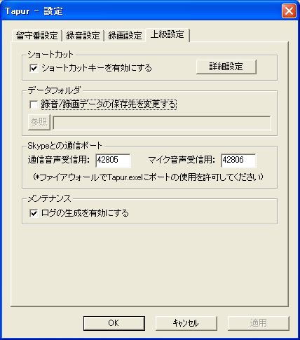 『上級設定』-『ショートカット』 グローバルショートカットキーを設定します。この機能により、Tapurの基本的な機能をキーボードのみで利用することができます。 『上級設定』-『データフォルダ』 Tapurの録音・録画ファイルは通常Cドライブに作成されますが、Cドライブの容量が不足している場合、その保存先を変更することが可能です。 『上級設定』-『Skypeとの通信ポート』 Tapurは録音時にポートを使用してSkypeと通信を行います。その際に使用するポート番号を指定します。 ファイアウォールをご使用の場合、録音時に警告メッセージが表示されますので、Tapurのポート使用を許可してください。 『上級設定』-『メンテナンス』 ログファイルの出力の有無を制御します。 ログは障害対応の場合などに使用されます。(FAQ[障害が発生した場合は?] 参照)