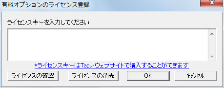 (ライセンス例) 例えば、以下のようなランセンスコードが通知された場合、先頭の EExu... から末尾の ...Sw== までをマウスで選択し、コピーペーストしてください。 行の折り返し部分は改行ではありませんので、余分な改行等が入らないようご注意ください。 EExuM/YnmddzHLcxtDaCrwY0k3/qpOXDNf/chji39x+sSF7iger98sisX1yXSnwdt2swCRJdpp6KCrvQmVNHiBi39oLjD0J/pb7P0Jt8VqY17bYSw== 『ライセンスの確認』 現在登録済みのライセンス情報を表示します。 『ライセンスの消去』 現在登録済みのライセンス情報を削除します。 [Tapurについて] バージョン情報、著作権等を表示します。