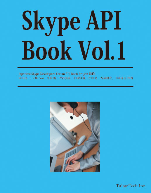 私も執筆に参加した『Skype API Book Vol.1』が発売されました。 SKypeAPIのための開発本としては、世界で唯一(たぶん)のものだと思います。 以下のサイトで立ち読みもできますので、SKypeAPIの開発に興味のある方は、ぜひ覗いてみてください。 そして、便利なスカイプツールを作り、Vol.2, Vol.3の執筆に参加しましょう。 『Skype API Book Vol.1』 ― Talpa-Tech Inc.